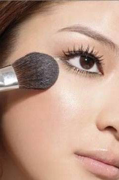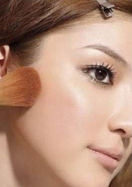 此处我们要选择贴近肤色的蜜粉来修容,用修容刷在双颊至发际处刷抹让脸庞缩小。同时还可以选用桃红色腮红在笑肌上轻刷并向斜后方推开,颜色不需太浓烈,否则会破坏裸妆的冷艳效果。