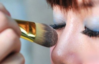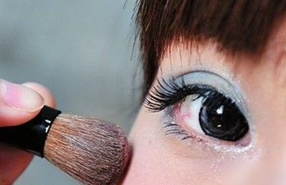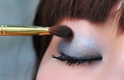选择带有细微闪光颗粒的眼影膏打造如冰霜般透亮的眼部效果,先用冰蓝色涂在眼窝范围制造轮廓感,再将深蓝色涂在眼尾根部制造层次感。