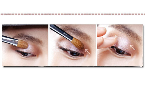 利用深浅颜色组合的眼影,按照双眼皮皱褶部位及眼尾部颜色最深、然后逐渐变浅的顺序,涂抹在眼睑的相对位置,即可打造层次感强的基本眼妆。底妆不必过于强调闪亮,加强深邃感即可。