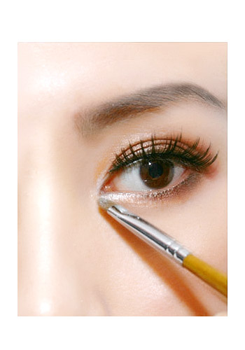 然后再用最小号的眼影刷,取少量珍珠光泽眼影轻点于眼头和下眼线位置。可以让眼睛即时放大,清透水亮,使眼妆整体更加趋于剔透自然。