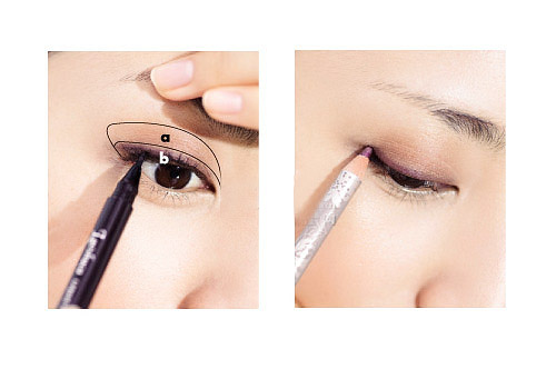 在珍珠光泽的眼影打造大功告成之际,选择防水不易晕染的眼线液或眼线笔,紧贴睫毛根部从眼头至眼尾的描绘眼线,填满睫毛空隙。眼尾处的眼线可适当加粗并拉长,可令眼睛变得更大。