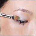 先沾取绿色眼影,并刷在上眼皮的后1/3处即可,想要让眼睛拉长,可由前往后刷,并在眼尾处稍微上扬,若想让眼睛变圆,则由后往前刷,不刻意强调眼尾。