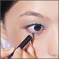 使用了较浅的眼影色后,建议一定要再加上深色的眼线,才不会让双眼看起来无神,所以同样选了较深的蓝色系眼线笔,在靠近下睫毛根部的地方轻轻描绘出眼线。