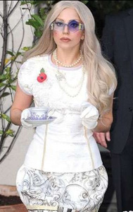 图四:Lady Gaga每次都要出人不意,造型走的是名媛风,发型也是柔软的微卷。这个紫色镜片的墨镜更有gaga的风格。