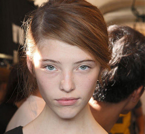 裸妆依旧是春夏的主调。2012春夏秀场上,对于Sharon Wauchob这季打造的裸妆,印象深刻。妆容自然清新,虽经精心修饰,但并无刻意化妆的痕迹,干净透明。只是在眉妆上按照原有的眉形,淡淡描绘了一点。轻柔的眼线和眼影,让眼睛显得明亮清澈。这种低调的妆容适合大部分女性,非常实用。