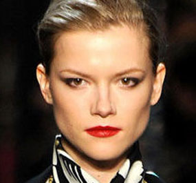 黑色眼影会让你的眼睛充满神秘感,如果没有处理好会像黑眼圈,但是只要保持在外眼角处角度,整个造型会看起来富有魅力,就像Diane Von Furstenberg秀场上一样,在打造这款眼妆上要保持眼睑处的干净,可以适当用带有珠光的肤色眼影略扫一遍,并用黑色金属眼线在外眼角处画上一个细细的V字型,皮肤尽量保持裸妆的效果,可以用保湿霜加遮瑕膏遮盖脸部瑕疵,同时画上鲜艳的红唇。