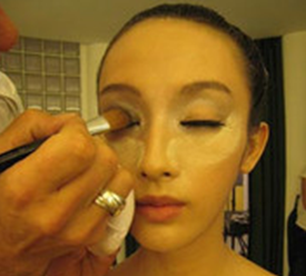 Step1:用亮色系的米白色眼影涂抹在眼窝处,呈半月形状,使眼皮看起来明亮。