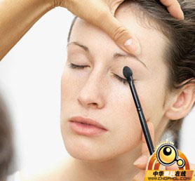 闭上眼睛涂眼影,容易因眼影涂抹过重而导致眼睛有浮肿感。因此,要睁开眼睛使用眼影棒轻轻抹金棕色眼影。注意,阴影的线条不要比眼角长,而瞳孔上方应略粗,眼睛才显得大。