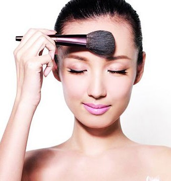 额头、鼻梁、下巴、双颊都是需要提亮的重点部位,不同位置提亮手法也不同,双颊和下巴,用刷子蘸取提亮粉轻轻掸掉多余的,再以打圈手法提亮。额头和鼻梁,以清扫的方式,同时注意面积不要越扫越大。