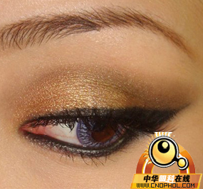 第三步:用铅笔刷,强调加深外眼角的色彩,并且用偏深一些的金铜色打造眼窝褶痕的轮廓。