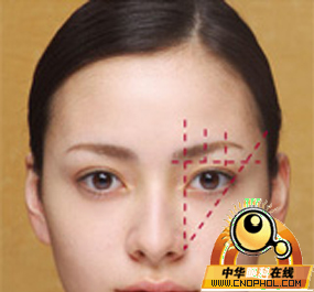 ①眉头从内眼角正上方开始,眉尾在鼻翼至外眼角相连接的延长线上。