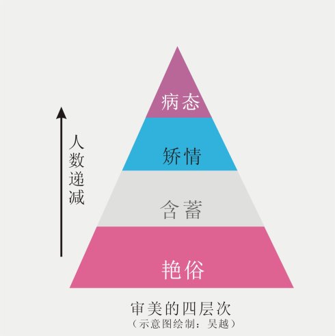 这是我画的一张示意图。上边列出了我们的审美的大致这么四个层次。处于金字塔最底层的也是人数最多的这种审美呢,我们姑且形容它为艳俗。什么叫艳俗?流行歌曲、流行服饰就是。还有我们可以去农村地区以前经常看的到的大花布棉袄,还有用它做的被子面等等,大红大绿,视觉冲击力极强,这些东西的受众很广泛,群众基础也很广大。城市里的一些青年,经常追逐的所谓流行服装或者身体上的一些打扮和装饰,你也经常可以看到这样的类似情况,比如,近年来,一下子,许多男孩就开始打耳钉,街上转悠一下,稍微长的顺眼点的,他就都弄个耳钉带上。诸如此类的等等,事主本意呢,是追求时尚、前卫,然后跟着流行元素跑,所以,这类呢有很广泛的群众基础,它的本质就是艳俗的,和农村的流行的一些东西和事物,实质是一样的。