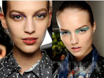 从2013的春夏秀场中,我们不难看出这一季彩妆大师们对色彩的运用,戏剧般夸张的使用了蓝色、紫色、橘色,明媚而灿烂几乎是造型师们统一的心境。更为耀眼的是2013DIOR春夏上演的水晶眼妆,施华洛世奇水晶颗粒使模特们更加闪耀,富有华美质感。
