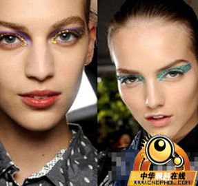 从2013的春夏秀场中,我们不难看出这一季彩妆大师们对色彩的运用,戏剧般夸张的使用了蓝色、紫色、橘色,明媚而灿烂几乎是造型师们统一的心境。更为耀眼的是2013DIOR春夏上演的水晶眼妆,施华洛世奇水晶颗粒使模特们更加闪耀,富有华美质感。