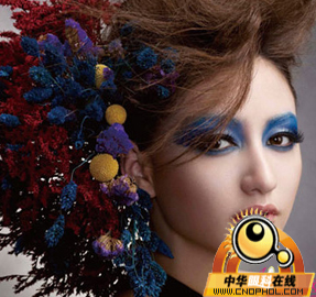 深蓝色眼影柔和了黑色烟熏给人带来的过于不羁的形象,呈现女人精灵般活泼的美。如此深沉浓烈的色彩,与分明的眼线和假睫毛搭配,使双眼充满深邃的异域风情,双颊的红色和粉嫩的唇彩增添了东方少女原本的恬美。