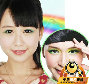 步骤四:在上眼睑的前1/ 4 处涂抹浅绿色眼影 ,后3/4 处涂抹淡蓝色眼影,然后用干净的眼影刷将两种颜色过渡均匀。用绿色眼影描画下眼睑轮廓,眼头处用珠光白色提亮,与上眼睑色彩呼应,有层次又不凌乱。