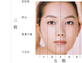 首先,我们在面部正中作一条垂直的通过额部-鼻尖-人中-下巴的轴线;通过眉弓作一条水平线;通过鼻翼下缘作一条平行线。这样,两条平行线就将面部分成三个等分:从发际线到眉间连线;眉间到鼻翼下缘;鼻翼下缘到下巴尖,上中下恰好各占三分之一,谓之“三庭”。“五眼”呢?是指眼角外侧到同侧发际边缘,刚好一个眼睛的长度,两个眼睛之间呢,也是一个眼睛的长度,另一侧到发际边是一个眼睛长度。这就是“五眼”。所以好看的女孩,至少要符合“三庭五眼”,这是最基本的标准。