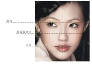 就是在一个人的面部上画上一个“丰”字,来进一步判断是美还是丑。先作面部的中轴线,再通过太阳穴(颞部)作一条水平线,通过两侧颧骨最高点作一条平行线,再通过口角到下颌角作一条平行线。形成一个“丰”字。