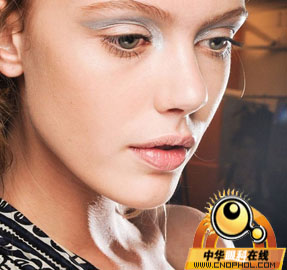 晕开下眼线尾部。在上下眼尾处将眼线用小刷子晕染开,下眼线选用眼影粉淡淡描画,再点上银色闪粉 让眼珠水汪汪的,电力十足。