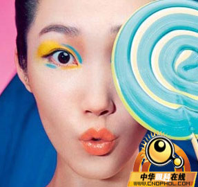 眼睛偏肿时,彩色眼影可以小面积使用,以点、线、圆形等图案来表达,会使眼妆更有趣味更有层次。