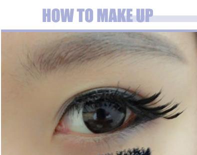 步骤三:假睫毛选择眼尾加长款的,沿着眼线仔细贴到上眼皮处,再用睫毛夹把真假睫毛夹到一起,睫毛夹可以用吹风机加热一下,这样夹出来会更加持久。