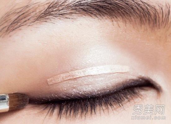 4.以米色珠光眼影刷在下眼头和下眼睑前1/4处打亮。