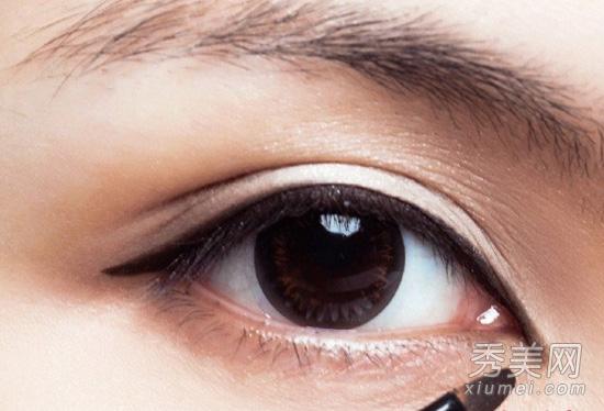 3.用深咖啡眼影顺着眼线重迭上去,柔和线条的锐利感。