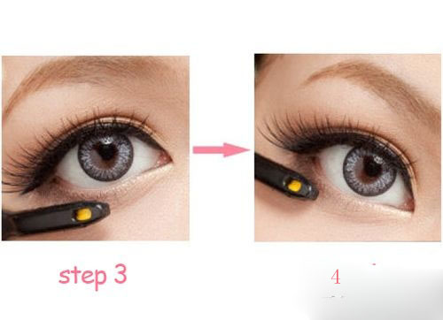 3.烫向下翘的中段睫毛,扩大眼睛纵幅。将烫睫毛器慢慢移至中段睫毛处,适当拉长睫毛长度和卷度,制造动人的洋娃娃效果。