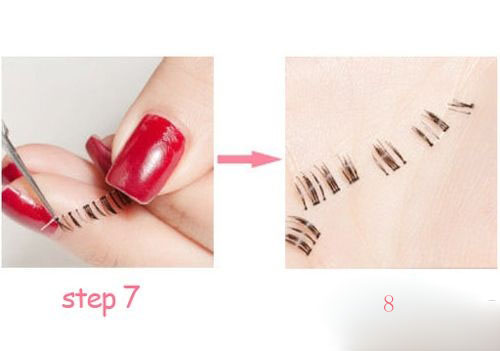 8.睫毛剪成一束束再开始黏。下睫毛和上睫毛不一样,千万别走浓墨重彩路线,轻轻剪成一束束再准备粘贴。剪时一定要注意力度哦!