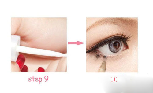 6.眼睛根部涂抹黑眼线 让眼睛更有神。下睫毛根部的缝隙也是需要填补的,快拿起黑色眼线笔均匀涂抹,眼线笔的质地更容易在这种细小部位着色哦。