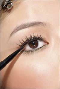 5.眼尾斜后拉开,胶描绘上内眼线增加眼部的神韵。眼尾斜后拉开,将笔刷沾取黑色眼线胶描绘上内眼线,让妳的眼眸无论是在哪个角度欣赏,都能完美无瑕疵,且可增加眼部的神韵,对于想打造SEXY彩妆更是不可或缺的步骤。