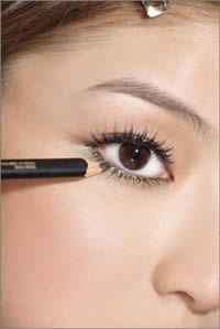 3.绿色眼线笔描绘下眼线突显眼形轮廓。用橄榄绿色蜡质眼线笔描绘整个下眼线,下眼线描绘的目的除了能清楚的勾勒眼形轮廓外,也能让眼睛更加立体而被突显!