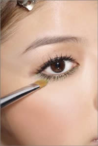 2.用笔刷沾取珠光亮片的粉金色眼影定妆用眼影笔刷沾取富含细微珠光亮片的粉金色眼影粉,轻轻刷涂层叠于上眼皮,除了有定妆的效果,也能让眼部肌肤更明亮,散发美丽的光采。