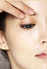 5、轻轻的拉起眼皮,视线注视下放,用眼线笔画内沿线(指睫毛根处),将Step1遗漏空隙全部填黑填满。