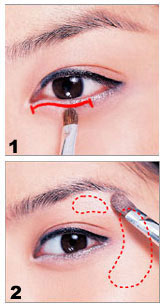 Step 2:再把珠光眼影也刷在眉骨、眼周“C”区,使眼型更立体。