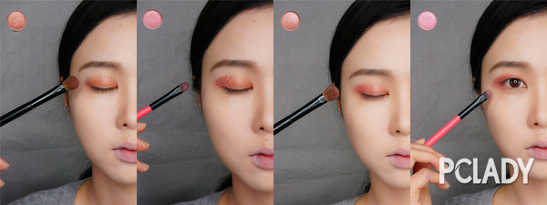 首先用到A色,晕染整个眼窝,眼皮折略向上一些。
