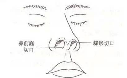 切口位置:鼻孔缘、鼻小柱蝶形切口。