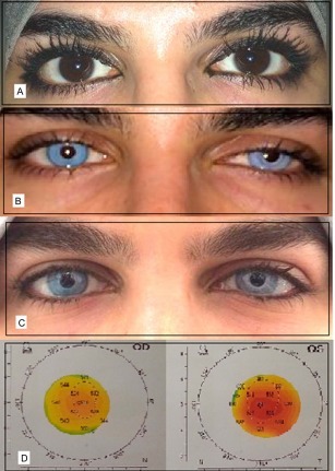 图 1 为案例 1 美容效果,A 为患者原始黑色眼色;B 为首次接受角膜染色术后淡蓝眼色;C 为修整后更加自然的蓝灰眼色;D 为染色后地形图