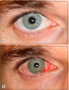 图 4 为案例 5 美容效果,A 为患者术前蓝色虹膜;B 为术后棕色虹膜