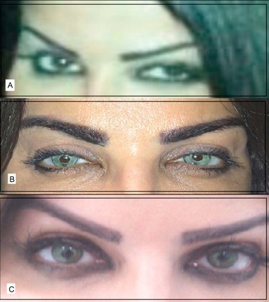 图 2 为案例 2 美容效果,A 为患者原始黑色眼色;B 为接受角膜染色术后眼色;C 为 1 年随访期间更加自然的绿色眼色