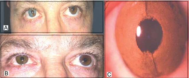 图 3 为案例 3 美容效果,A 为患者术前眼色差异,左眼为灰色,右眼为蓝色;B 为接受角膜染色术后眼色;C 为 6 个月后裂隙灯摄影
