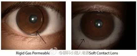 一定要过夜佩戴隐形眼镜怎么办呢?我们有透气性硬质角膜接触镜(RGP)!可以连续配戴7天哦。区别于一统江山的软性隐形眼镜,还有两种小众的隐形眼镜,一种是早已淘汰的硬性(Hard)不透气的,第二种就是硬质的(Rigid),意思是形状不易弯曲。图3示:RGP与软性隐形眼镜的大小和位置区别。左侧较小的就是RGP,可以看到它没有角膜大(在角膜缘以内),所以容易在角膜上移动位置。