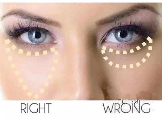 上图左边的遮瑕范围才是正确的哦,在进行黑眼圈遮瑕的时候,不要只局限在眼底的月牙位置,应该以倒三角的型状向下做延伸。