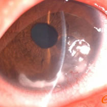 开始时仅有眼部划物敏感或刺激感,伴有视力模糊。有外伤史者,在受伤后数天内出现溃疡,发展较缓,和外伤后迅速发展的绿脓杆菌性角膜溃疡有所不同。 早期眼睑红肿及畏光流泪等刺激症状轻重不等,严重阶段刺激症状大多反见较轻。充血常很严重,主要为混合性,部分病例可有少量灰白色分泌物。 由于真菌菌株的不同,感染时间的久暂以及个体情况的差异,临床上所见到的溃疡形态很不一致。典型的早期溃疡呈灰白或乳白色,常为不规则形。表面粗糙,致密,略高出平面。溃疡和浸润的密度分布不均匀,溃疡与健区角膜分界大多清楚,溃疡边缘常不整齐。 较大的溃疡常为黄白色,多数为不规则圆形,表面似干燥粗略,呈“苔垢”或“牙膏”样。基质浸润致密,溃疡边缘稍有隆起。病变如发展,溃疡周围可见结节状或树根样基质浸润。 有人对于真菌性角膜炎常用以下名称描述。 菌丝苔波:是附着在溃疡表面的菌丝和坏死组织。色白不透明,微隆起,与健区角膜分界清楚。可刮除,刮除后的溃疡面较透明。 菌丝灶:是真菌菌丝长入角膜基质的病灶。表面微隆起干燥粗糙。混浊区的浸润密度浓淡不一致。质地较硬,用刀刮时,刀尖上附着的刮物很疏松。刮过后的溃疡仍混浊不透明。 菌丝灶边缘:有些溃疡边缘毛糙不齐。有时伸出树根浸润,称为“伪足”;或在溃疡周围出现孤立的结节状圆形浸润点,称为“卫星灶”。 反应环:在菌丝灶的周围有一圈炎性细菌浸润,一般不太宽,约1~2毫米,是机体对菌丝的防卫反应。有人称做“免疫环”。 分界沟:位于菌丝灶和反应环中间。此处炎症细胞浸润最多,是浅层组织坏死,轻度低陷而成的浅沟。 真菌性角膜溃疡的裂隙灯检查,溃疡的发展由浅层到深层。早期溃疡为浅表性,角膜厚度几乎无甚改变。溃疡底部为浓密的基质浸润,可达角膜全层的0.2、0.4、0.6不等。基质水肿虽轻,但常为全层性。正对菌丝灶后面的内皮,常有水肿粗糙及增厚,同时伴有皱褶,有人称做“内皮斑块”。有时整个角膜出现弥漫性雾状水肿,提示溃疡在发展中。 溃疡的发展过程,常先在周围或底部出现浸润,继而形成脓疡,脓疡坏死而成溃疡,溃疡面坏死组织不断融解脱落,使角膜逐渐变薄,最后导致穿孔。 穿孔一般较缓慢,位置、大小及形态不定。穿孔处经常微隆起,每有虹膜显露,中央穿孔时角膜略呈圆锥形。穿孔发生率约10%左右。 有时坏死组织虽未脱落,角膜即已出现“漏水”现象,以至前房在不知不觉中消失。又有时在坏死的角膜组织中,显露少许虹膜组织,亦是溃疡穿孔的另一种迹象。 溃疡一旦穿孔,炎症渐见减轻,但较在面积的穿孔,前房多数很难再度形成。溃疡坏死组织不断脱落,可使透明的后弹力层完全暴露,虹膜清晰可见,由于抵挡不住正常的眼内压,进而发展成角膜局部或全部葡萄肿。 当溃疡趋向愈合时,眼痛减轻,刺激症状改善,粘性分泌物消失,溃疡色泽由黄白转变为灰白色,溃疡表面清洁,周围上皮向内生长,荧光素着色范围缩小。前房积脓和丁道尔现象以及角膜后沉着物减少。溃疡愈合后,角膜基质仍有浸润及水肿,常需历时数月才能吸收。 溃疡愈合过程中可有新生血管伸入。细长单枝者少见,密集粗短的每见于菌丝灶周围,颇似角膜变小,角膜缘内移。 严重的虹膜睫状炎反应,是真菌性角膜溃疡特征之一。约50%病例可有前房积脓,自1毫米或2~3毫米,少数病例积脓可达前房一半以上,甚至充满整个前房。积肥脓呈乳白或淡黄色,前者为溃疡早期现象,而后者常代表炎症发展至严重阶段。脓液粘稠,不易移动。溃疡、脓疡以及前房积脓三者时在形态上融为一体,易于混淆,需裂隙灯切面检查,才能区别。 角膜后沉淀物有两种类型,一种是棕灰色的粉末状或细颗粒状,每见于溃疡早期,面积较小的病例,前房大多无脓或少量积脓。另一类是淡黄色浆糊样片状,或者是灰白色斑块状,附着于粗糙的角膜内皮面上,通常伴有前房积脓。前房积脓如果未能吸收,最后在前房角、虹膜、晶体表面形成机化膜。 真菌性角膜溃疡已经愈合,上皮生长,荧光素完全不染色时,在短期内仍有复发可能,这是同细菌性溃疡不同之处。