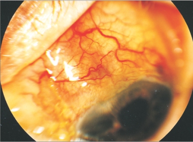 (4)阴虚火旺:结节不甚高隆,血丝色偏紫暗,有轻度肿胀,压痛不明显,眼酸痛,畏光流泪,伴口咽干燥,潮热,便秘不爽,舌红少津,脉细数。