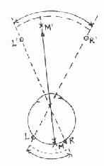 黄斑(M)影像笔直向前(M');位于黄斑区右侧的点面R的影像,出现于M'的左侧空间(L');而位于黄斑区左侧的点面L的影像,则出现于M'的右侧空间(R')