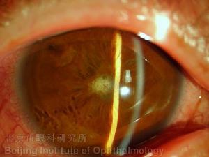 3.房水混浊:由于炎症使房水中蛋白含量增加,房水变混,在裂隙灯下房水中呈淡恢色反射性反光带,名为Tyndall征。表示为活性炎症体征。重者可出现纤维素性及脓性渗出物,因重力关系沉积在前房下部显示一液平面即为前房积脓(hypopion)。如果血管破裂,红细胞外溢,即产生前房积血(hyphema)。