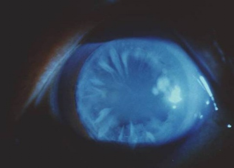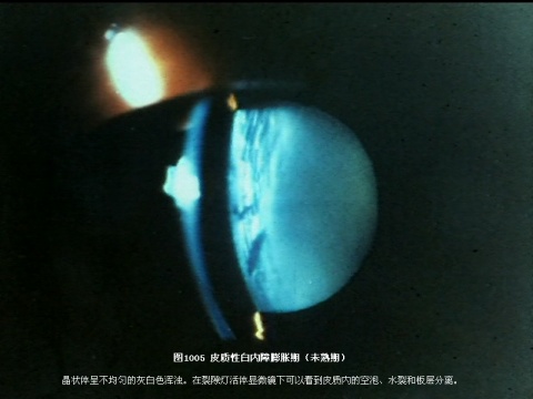 (2)膨胀期(intumescent stage):又称未熟期(immature stage)。晶状体混浊继续加重时,渗透压改变,在短期内有较多水份积聚,晶状体急剧肿胀,体积变大,将虹膜向前推移,前房变浅,可诱发急性闭角型青光眼。晶状体呈不均匀的灰白色混浊,在裂隙灯下仍可看到皮质内的空泡、水裂和板层分离。视力明显减退,眼底难以看清。