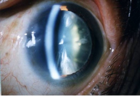 后囊膜下浅层皮质出现棕黄色混浊,为许多致密小点组成,其中有小空泡和结晶样颗粒,外观似锅巴状。由于混浊位于视轴,所以早期出现明显视力障碍。此类白内障进展缓慢,后期合并晶状体皮质和核混浊,最后发展为成熟期白内障。