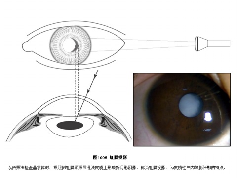 临床表现 常双眼患病,但发病可有先后,严重程度也不一致。主要症状为,眼前阴影和渐进性、无痛性视力减退。由于晶状体吸收水份后体积增加,屈光力增强。因晶状体纤维肿胀和断裂,使屈光度不均一,可出现单眼复视或多视。因吸收水份,晶状体纤维肿胀,注视灯光时可有虹视现象。由于光线通过部分混浊的晶状体时产生散射,干扰视网膜上成像,可出现畏光和眩光。